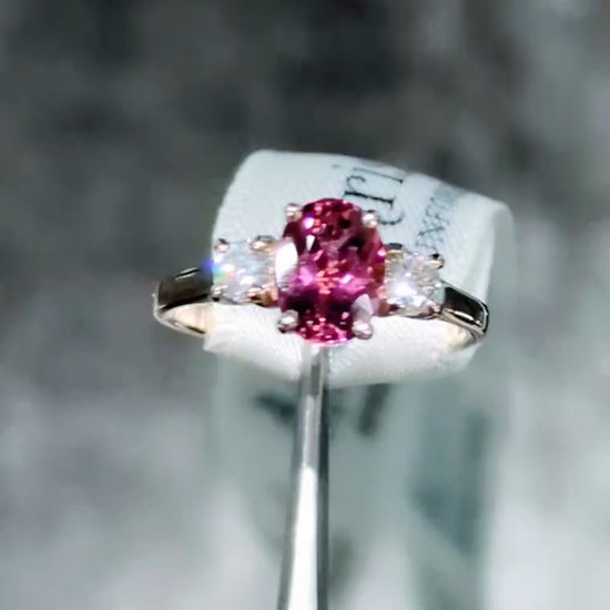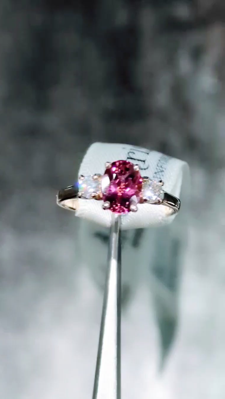 The pink tourmaline is an intense fuchsia pink shade with lots of sparkle due to the quality of the cutting. It measures 8mm by 6mm and weighs 1.46ct.
