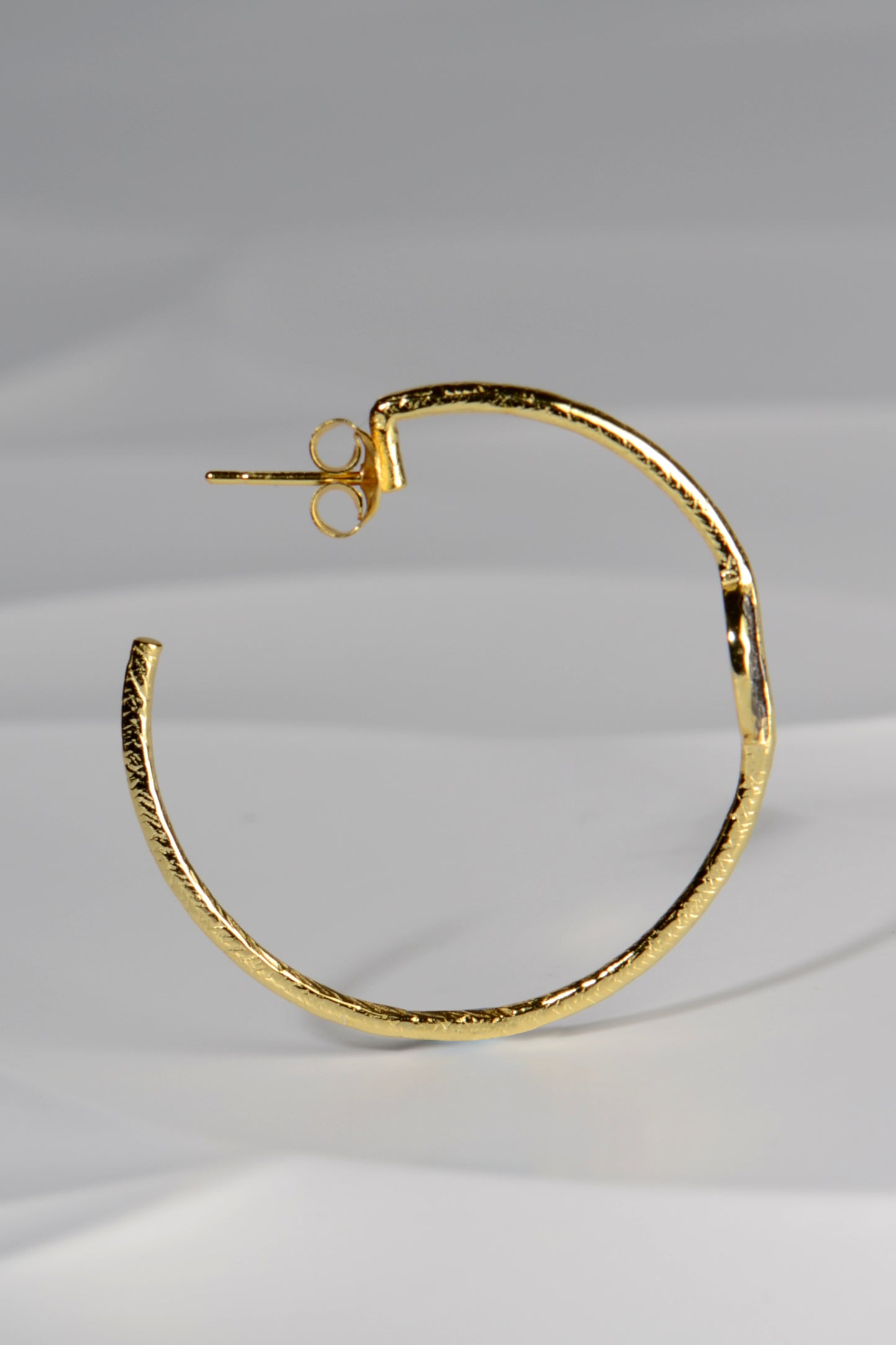 These large statement hoop earrings have a 9mm textured disc at the front and the narrow gold plated hoop is 1.5mm wide. These earrings have a post and butterfly fitting